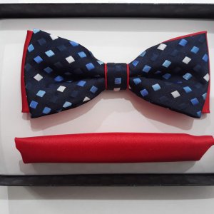 Elegancka mucha w zestawie z poszetką, granatowa w niebieski wzorek. Mucha to dodatek, który stanowi bazę garderoby eleganckiego mężczyzny. Zgodnie z płynącym obecnie trendy modowym nie ma obowiązku, który mówiłby o łączenia jej z frakiem czy kołnierzykiem łamanym przy koszuli. Moda nowoczesna zestawia muchę nie tylko ze stylem eleganckim, ale również z luźnym i sportowym strojem. Niebanalna mucha orzeźwi tradycyjny garnitur, jak również wyśmienicie będzie się komponować ze sportową marynarką czy luźnym kardiganem.