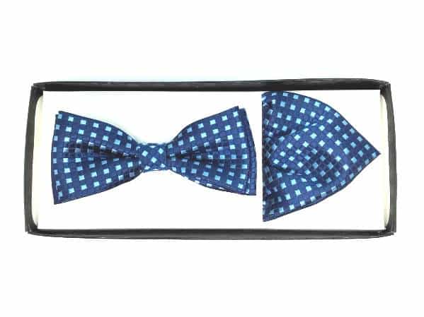 Unikatowa mucha w zestawie z poszetką, granatowa w niebieskie kwadraciki.