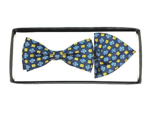 Unikatowa mucha w zestawie z poszetką, granatowa w niebiesko żółte kwiatuszki.