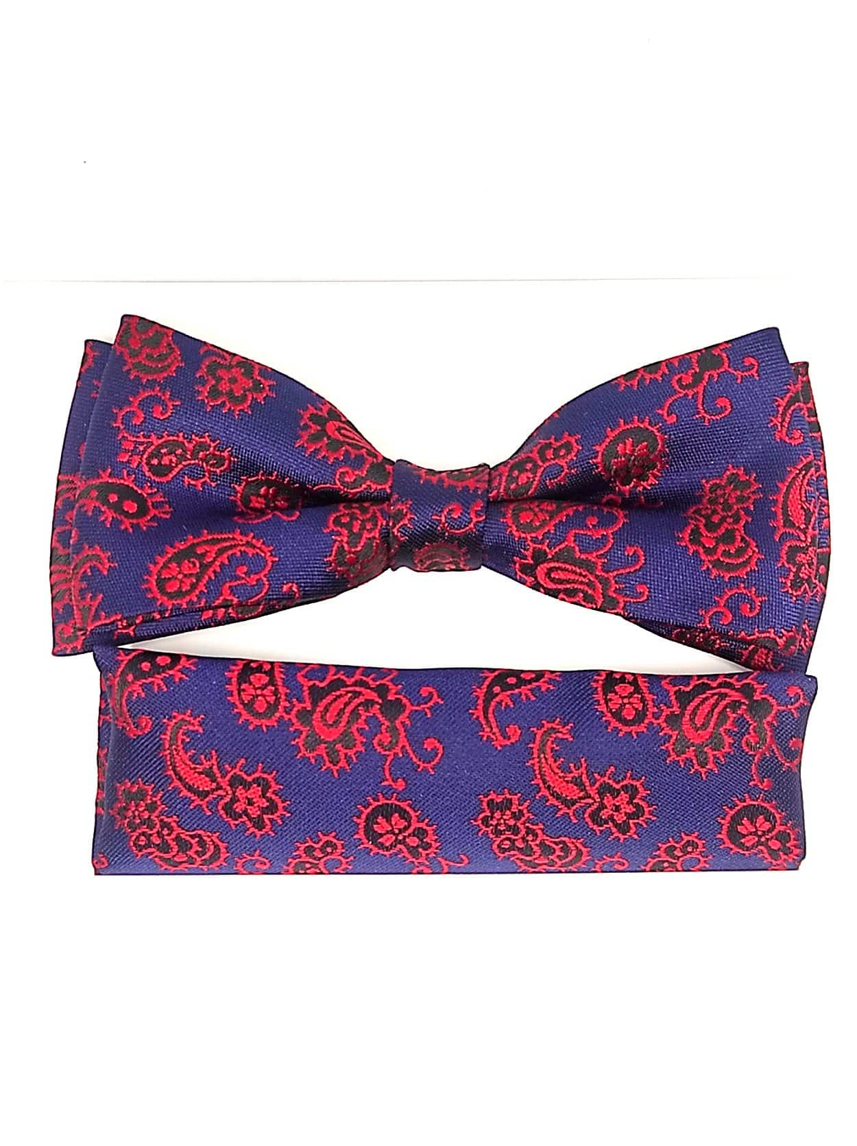 Unikatowa mucha w zestawie z poszetką granatowa w bordowy wzór.
