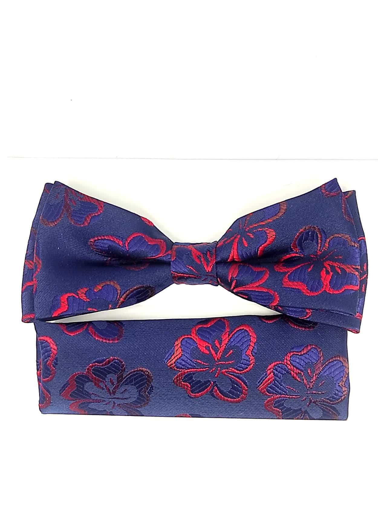 Unikatowa mucha w zestawie z poszetką granatowa w czerwone kwiaty.