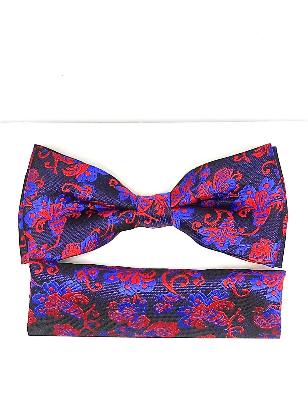 Unikatowa mucha w zestawie z poszetką granatowa w czerwono niebieskie kwiaty.
