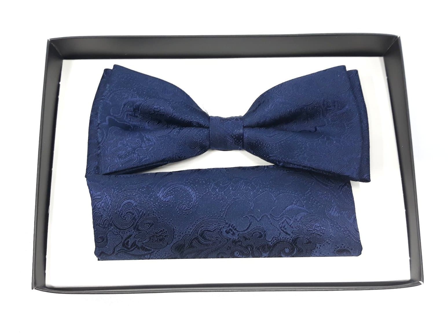 Elegancka mucha w zestawie z poszetką, granatowa w unikatowy tłoczony wzorek. Mucha to dodatek, który stanowi bazę garderoby eleganckiego mężczyzny. Zgodnie z płynącym obecnie trendy modowym nie ma obowiązku, który mówiłby o łączenia jej z frakiem czy kołnierzykiem łamanym przy koszuli. Moda nowoczesna zestawia muchę nie tylko ze stylem eleganckim, ale również z luźnym i sportowym strojem. Niebanalna mucha orzeźwi tradycyjny garnitur, jak również wyśmienicie będzie się komponować ze sportową marynarką czy luźnym kardiganem.