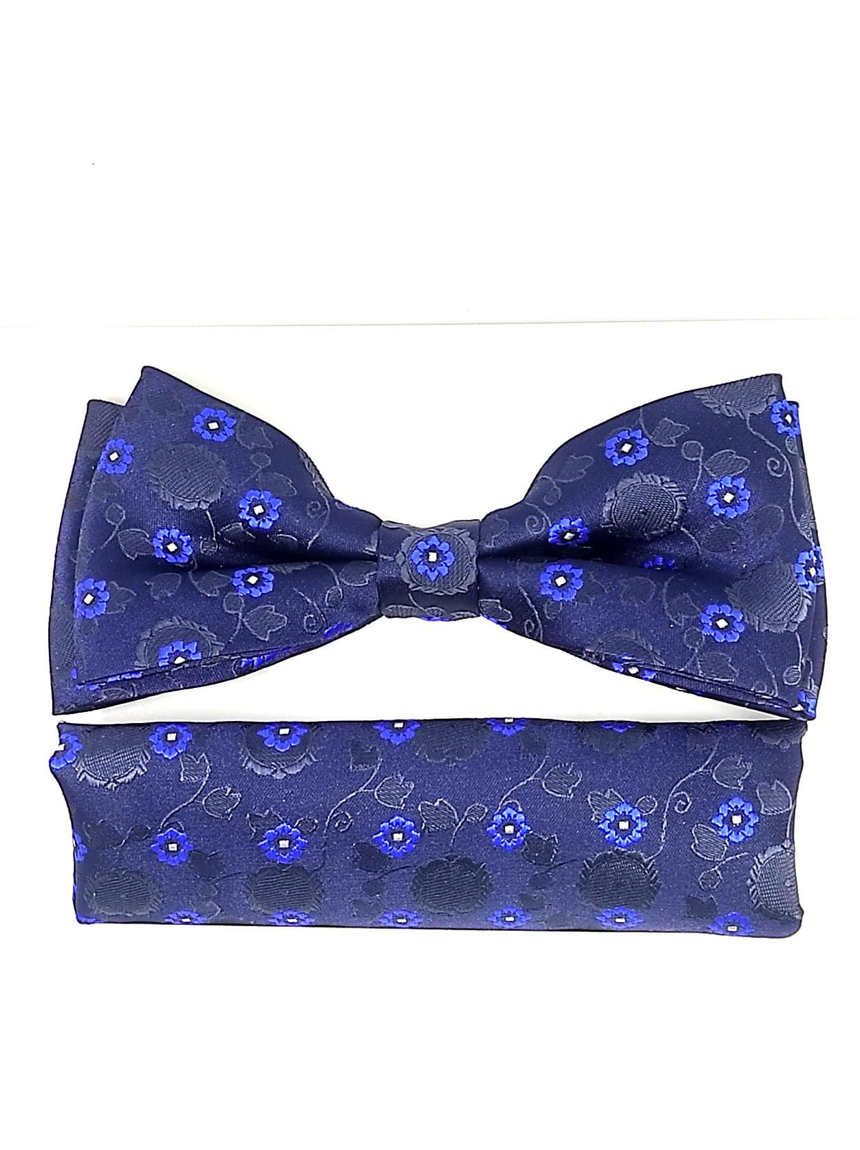 Unikatowa mucha w zestawie z poszetką granatowa w niebieskie kwiatki.