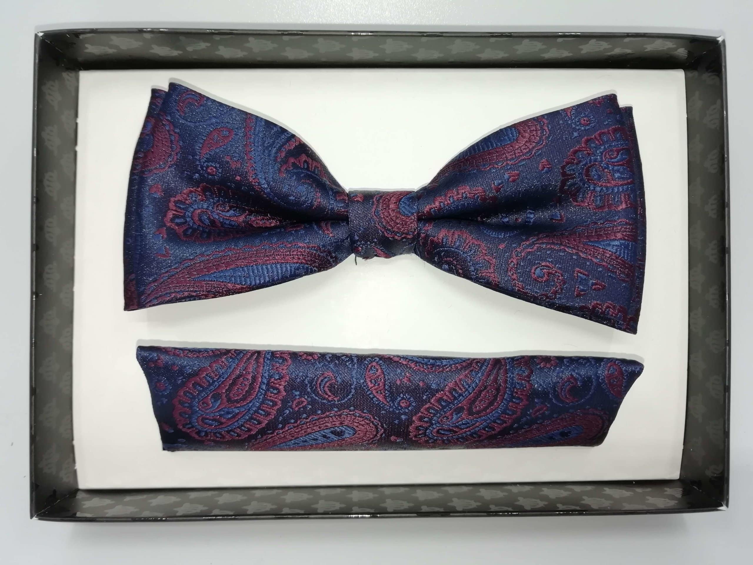 Elegancka mucha w zestawie z poszetką, granatowo bordowa we wzór. Mucha to dodatek, który stanowi bazę garderoby eleganckiego mężczyzny. Zgodnie z płynącym obecnie trendy modowym nie ma obowiązku, który mówiłby o łączenia jej z frakiem czy kołnierzykiem łamanym przy koszuli. Moda nowoczesna zestawia muchę nie tylko ze stylem eleganckim, ale również z luźnym i sportowym strojem. Niebanalna mucha orzeźwi tradycyjny garnitur, jak również wyśmienicie będzie się komponować ze sportową marynarką czy luźnym kardiganem.