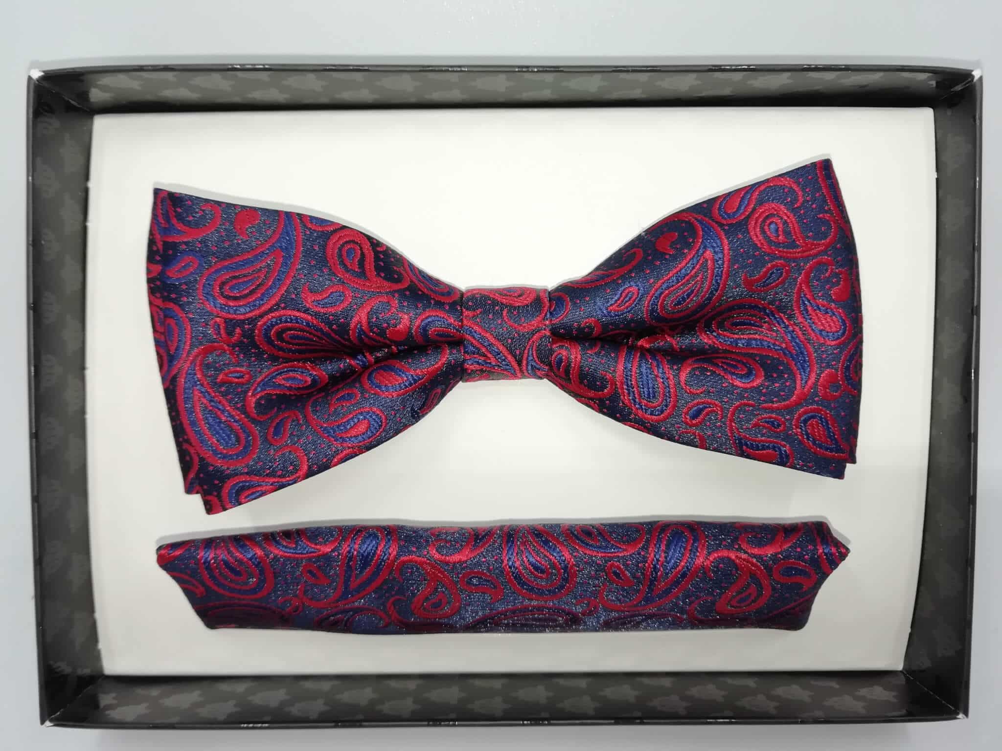 Elegancka mucha w zestawie z poszetką, granatowo bordowa ze wzorem. Mucha to dodatek, który stanowi bazę garderoby eleganckiego mężczyzny. Zgodnie z płynącym obecnie trendy modowym nie ma obowiązku, który mówiłby o łączenia jej z frakiem czy kołnierzykiem łamanym przy koszuli. Moda nowoczesna zestawia muchę nie tylko ze stylem eleganckim, ale również z luźnym i sportowym strojem. Niebanalna mucha orzeźwi tradycyjny garnitur, jak również wyśmienicie będzie się komponować ze sportową marynarką czy luźnym kardiganem.