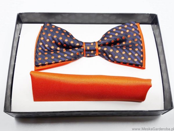 Elegancka mucha w zestawie z poszetką, granatowo pomarańczowa w kropki. Mucha to dodatek, który stanowi bazę garderoby eleganckiego mężczyzny. Zgodnie z płynącym obecnie trendy modowym nie ma obowiązku, który mówiłby o łączenia jej z frakiem czy kołnierzykiem łamanym przy koszuli. Moda nowoczesna zestawia muchę nie tylko ze stylem eleganckim, ale również z luźnym i sportowym strojem. Niebanalna mucha orzeźwi tradycyjny garnitur, jak również wyśmienicie będzie się komponować ze sportową marynarką czy luźnym kardiganem.