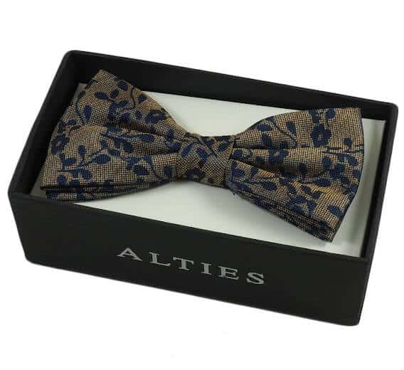 Unikatowa mucha w zestawie z poszetką, złoto pomarańczowa w granatowy wzór.