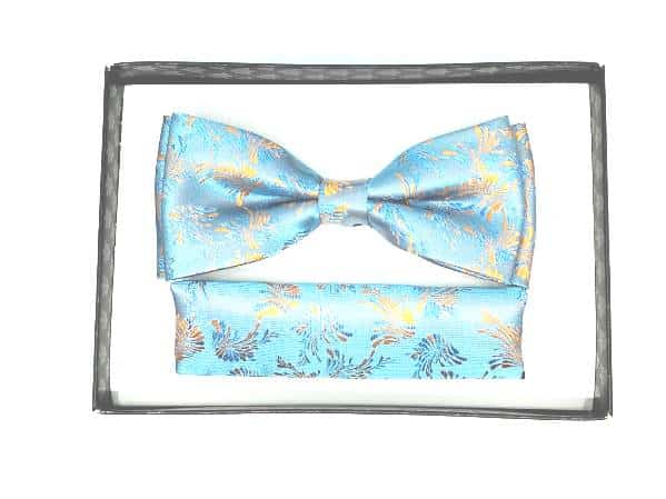Elegancka mucha w zestawie z poszetką, jasno niebieska w pomarańczowy wzorek. Mucha to dodatek, który stanowi bazę garderoby eleganckiego mężczyzny. Zgodnie z płynącym obecnie trendy modowym nie ma obowiązku, który mówiłby o łączenia jej z frakiem czy kołnierzykiem łamanym przy koszuli. Moda nowoczesna zestawia muchę nie tylko ze stylem eleganckim, ale również z luźnym i sportowym strojem. Niebanalna mucha orzeźwi tradycyjny garnitur, jak również wyśmienicie będzie się komponować ze sportową marynarką czy luźnym kardiganem.
