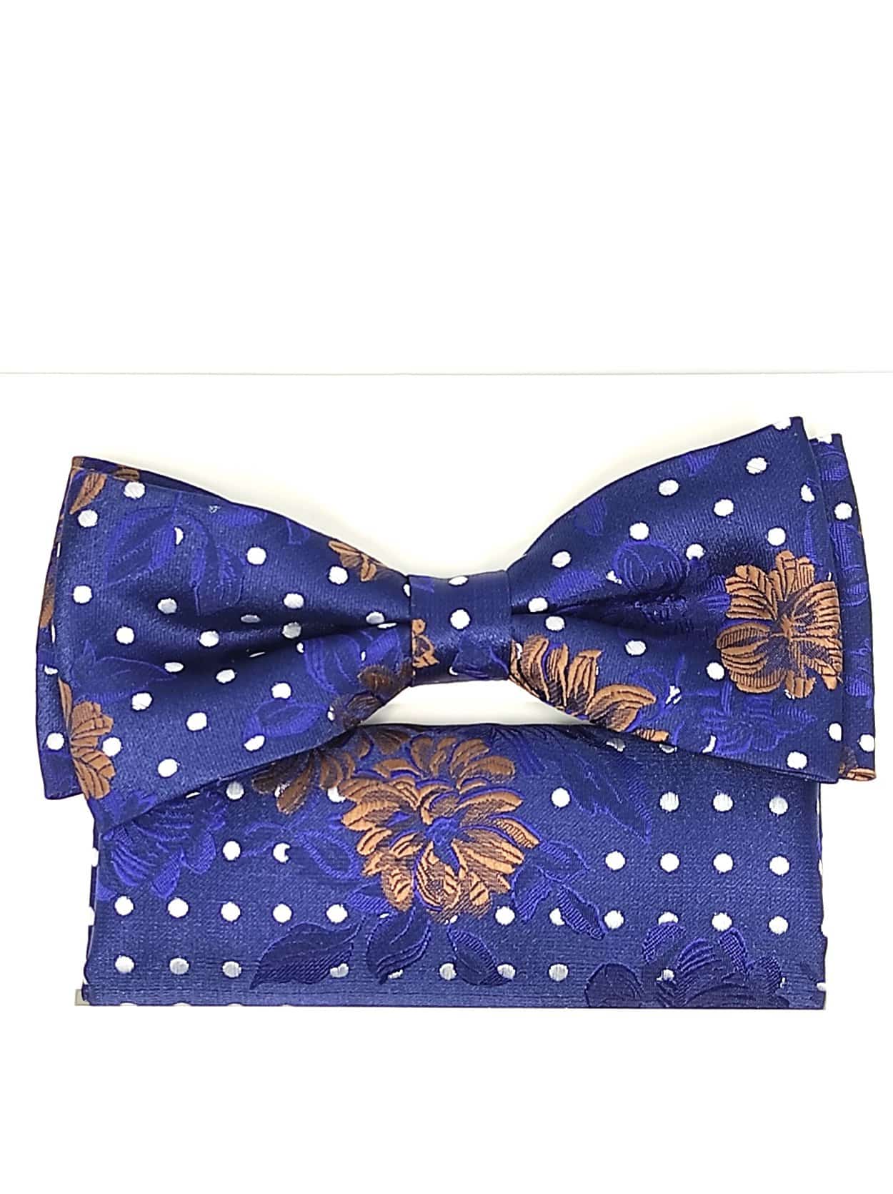 Unikatowa mucha w zestawie z poszetką granatowa w białe kropki oraz brązowe kwiaty.