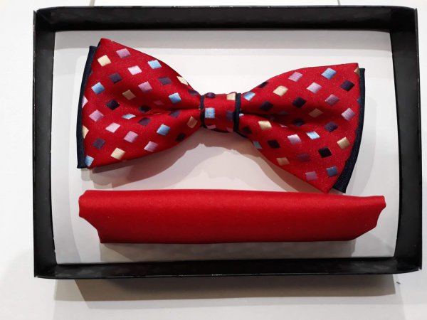 Elegancka mucha w zestawie z poszetką , czerwono granatowa w kwadraciki. Mucha to dodatek, który stanowi bazę garderoby eleganckiego mężczyzny. Zgodnie z płynącym obecnie trendy modowym nie ma obowiązku, który mówiłby o łączeniu jej z frakiem czy kołnierzykiem łamanym przy koszuli. Moda nowoczesna zestawia muchę nie tylko ze stylem eleganckim, ale również z luźnym i sportowym strojem. Niebanalna mucha orzeźwi tradycyjny garnitur, jak również wyśmienicie będzie się komponować ze sportową marynarką czy luźnym kardiganem.