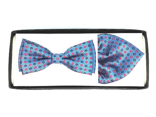 Unikatowa mucha w zestawie z poszetką, niebieska w czerwony wzorek.