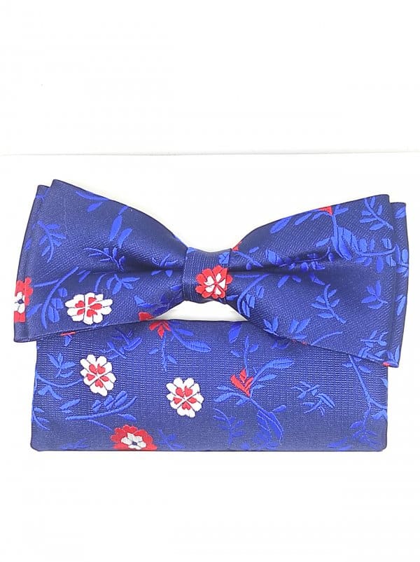 Unikatowa mucha w zestawie z poszetką niebieska w czerwone kwiatki.