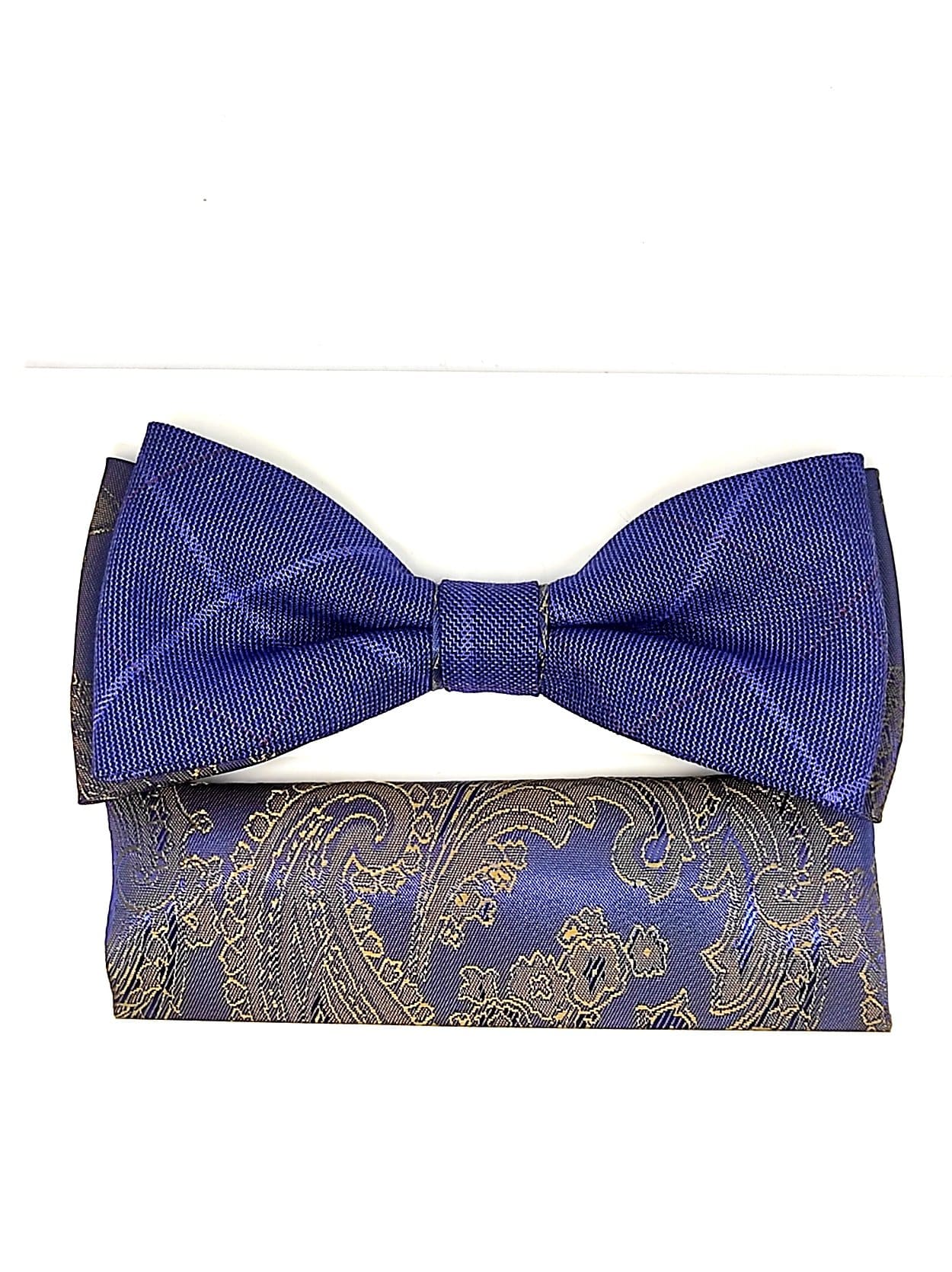 Unikatowa mucha w zestawie z poszetką niebieska wzór.