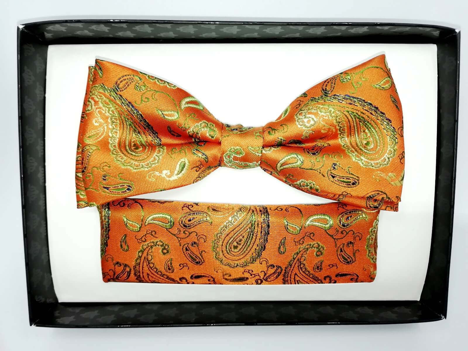 Elegancka mucha w zestawie z poszetką, pomarańczowo oliwkowa o unikatowym tureckim wzorze. Mucha to dodatek, który stanowi bazę garderoby eleganckiego mężczyzny. Zgodnie z płynącym obecnie trendy modowym nie ma obowiązku, który mówiłby o łączenia jej z frakiem czy kołnierzykiem łamanym przy koszuli. Moda nowoczesna zestawia muchę nie tylko ze stylem eleganckim, ale również z luźnym i sportowym strojem. Niebanalna mucha orzeźwi tradycyjny garnitur, jak również wyśmienicie będzie się komponować ze sportową marynarką czy luźnym kardiganem.