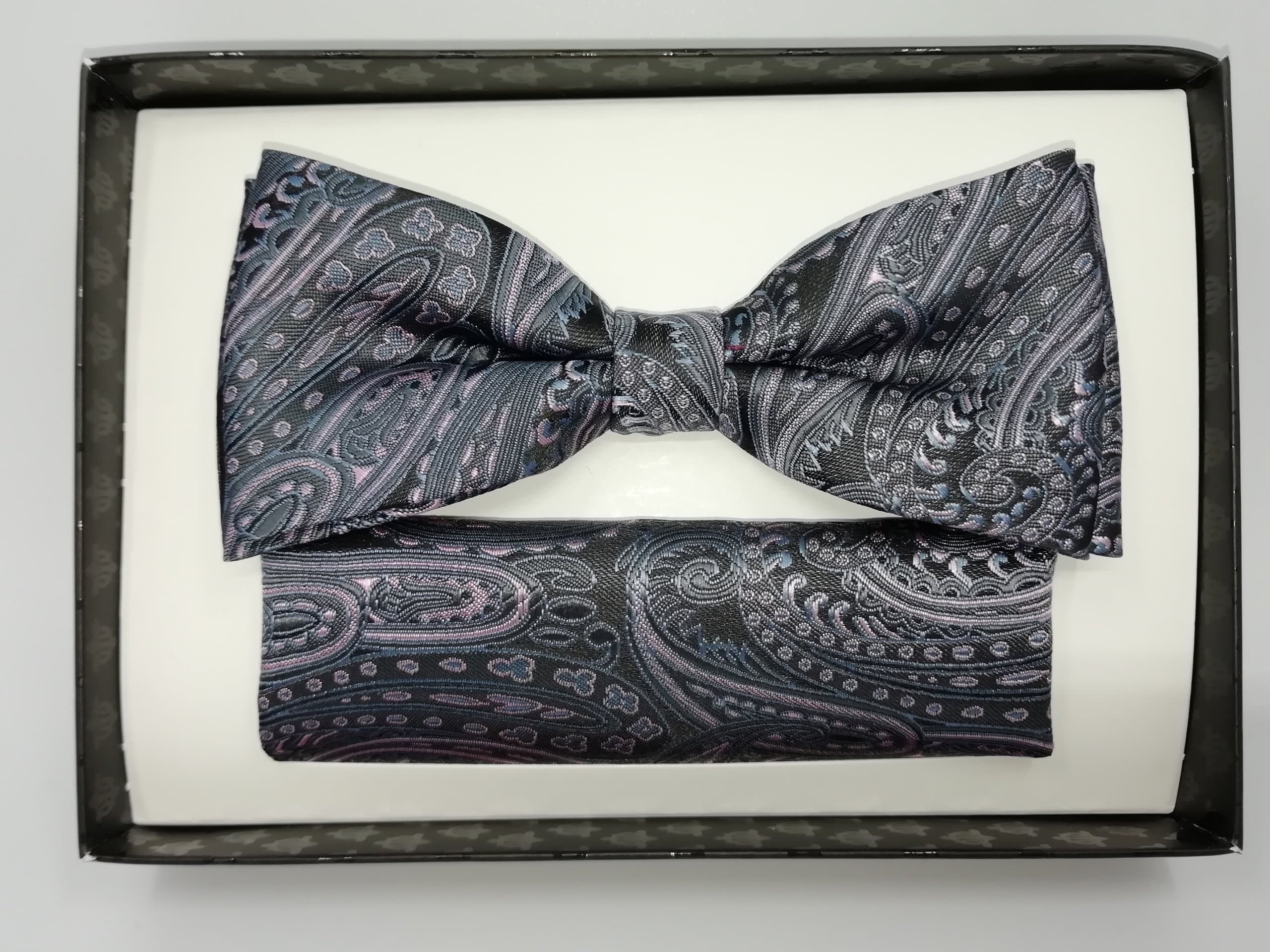 Elegancka mucha w zestawie z poszetką w kolorze szarym o unikatowym tureckim wzorze z odcieniami różu.