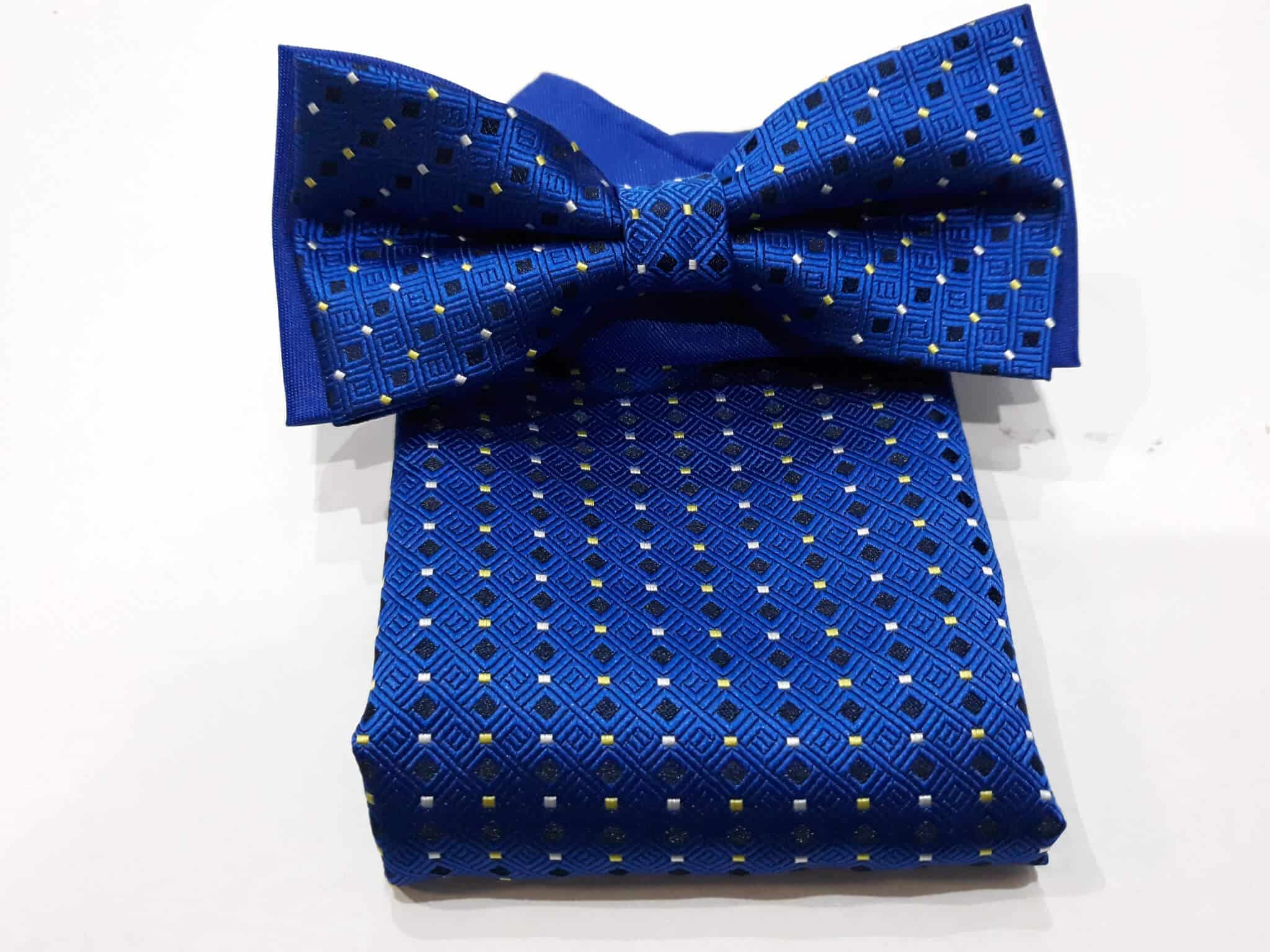 Elegancka mucha w zestawie z poszetką, szafirowa we wzorek. Mucha to dodatek, który stanowi bazę garderoby eleganckiego mężczyzny. Zgodnie z płynącym obecnie trendy modowym nie ma obowiązku, który mówiłby o łączeniu jej z frakiem czy kołnierzykiem łamanym przy koszuli. Moda nowoczesna zestawia muchę nie tylko ze stylem eleganckim, ale również z luźnym i sportowym strojem. Niebanalna mucha orzeźwi tradycyjny garnitur, jak również wyśmienicie będzie się komponować ze sportową marynarką czy luźnym kardiganem.