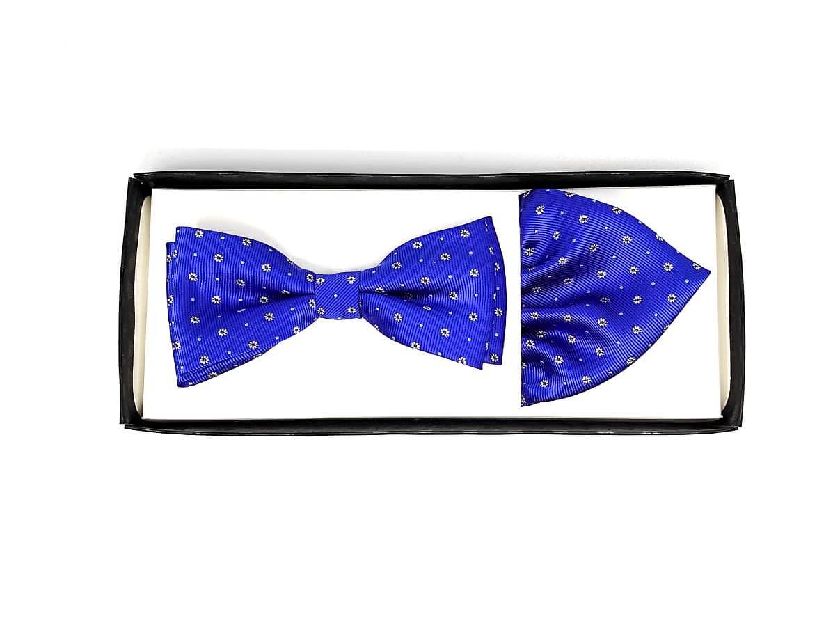 Unikatowa mucha w zestawie z poszetką, szafirowa we wzorek.