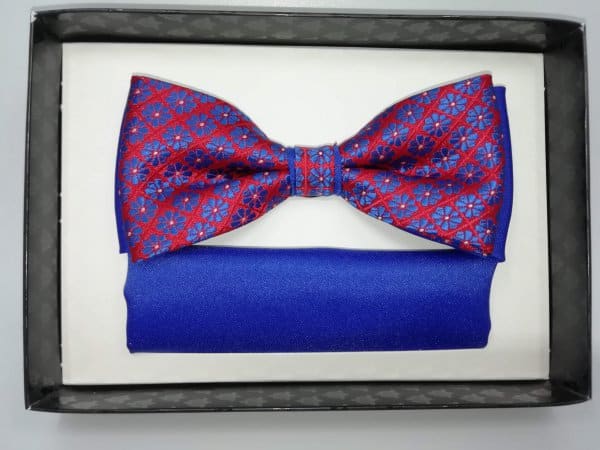 Elegancka mucha w zestawie z poszetką, szafirowa z dodatkiem czerwieni, muśnięta tłoczonym jasnym błękitnym wzorem. Mucha to dodatek, który stanowi bazę garderoby eleganckiego mężczyzny. Zgodnie z płynącym obecnie trendy modowym nie ma obowiązku, który mówiłby o łączenia jej z frakiem czy kołnierzykiem łamanym przy koszuli. Moda nowoczesna zestawia muchę nie tylko ze stylem eleganckim, ale również z luźnym i sportowym strojem. Niebanalna mucha orzeźwi tradycyjny garnitur, jak również wyśmienicie będzie się komponować ze sportową marynarką czy luźnym kardiganem.