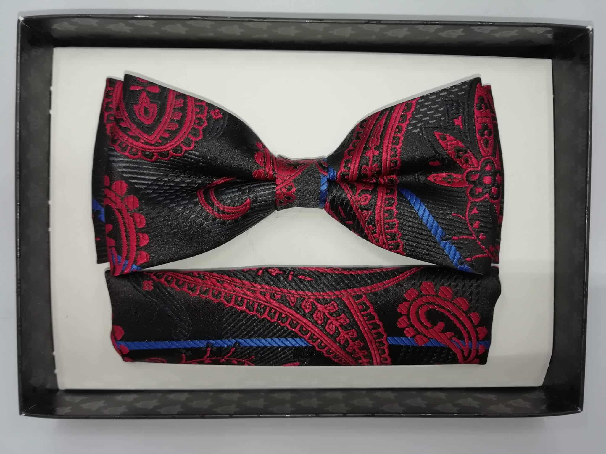 Elegancka mucha w zestawie z poszetką w kolorze czarnym z dodatkiem czerwieni stanowią unikatowy turecki wzorek.