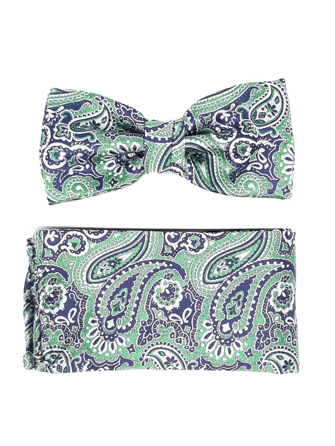 Unikatowa mucha w zestawie z poszetką, zielona z dodatkiem bieli i granatu w turecki wzór.