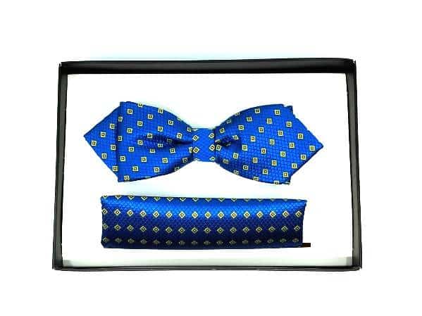 Unikatowa mucha w zestawie z poszetką niebiesko żółta.