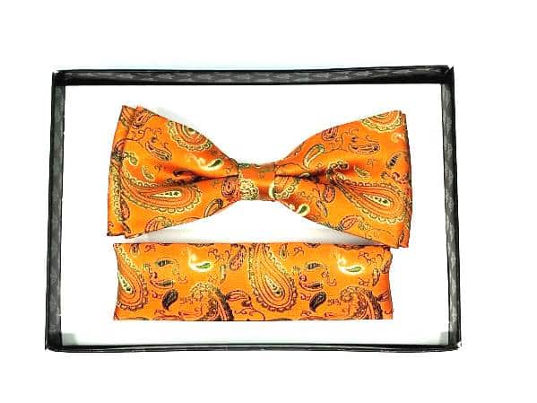 Unikatowa mucha w zestawie z poszetką pomarańczowa we wzór.