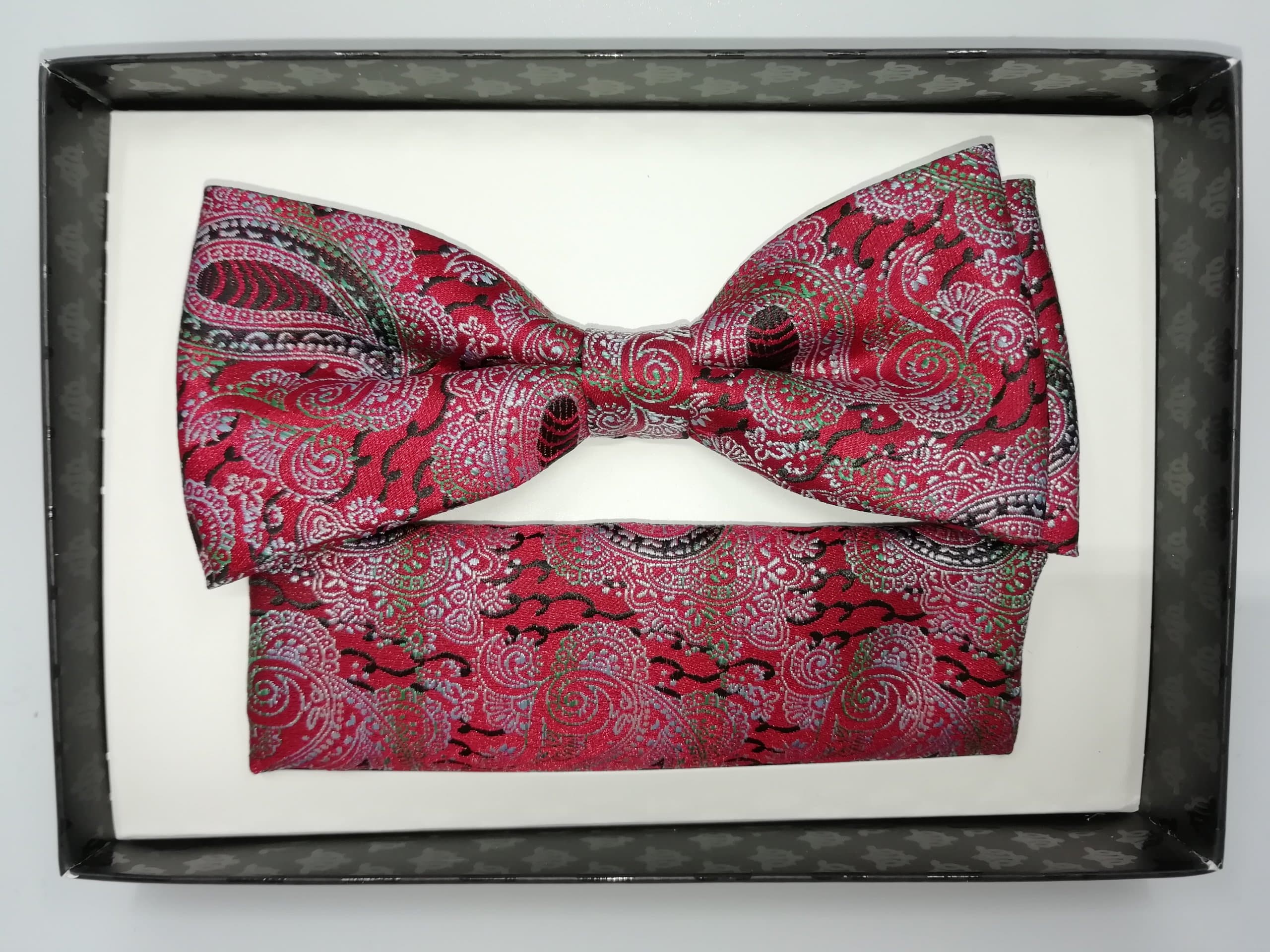 Elegancka mucha w zestawie z poszetką w kolorze czerwonym w unikatowy wzór turecki.