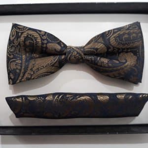 Unikatowa mucha męska plastikowa ze wzorkiem różyczek wraz z błekitną poszetką.