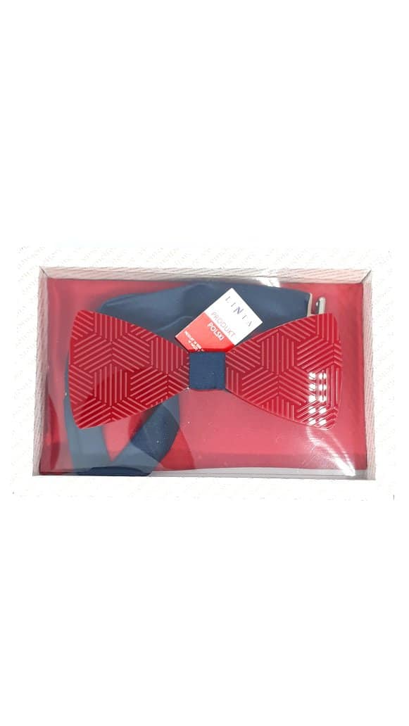Unikatowa mucha męska plastikowa, czerwona w kreski wraz z czerwoną poszetką.
