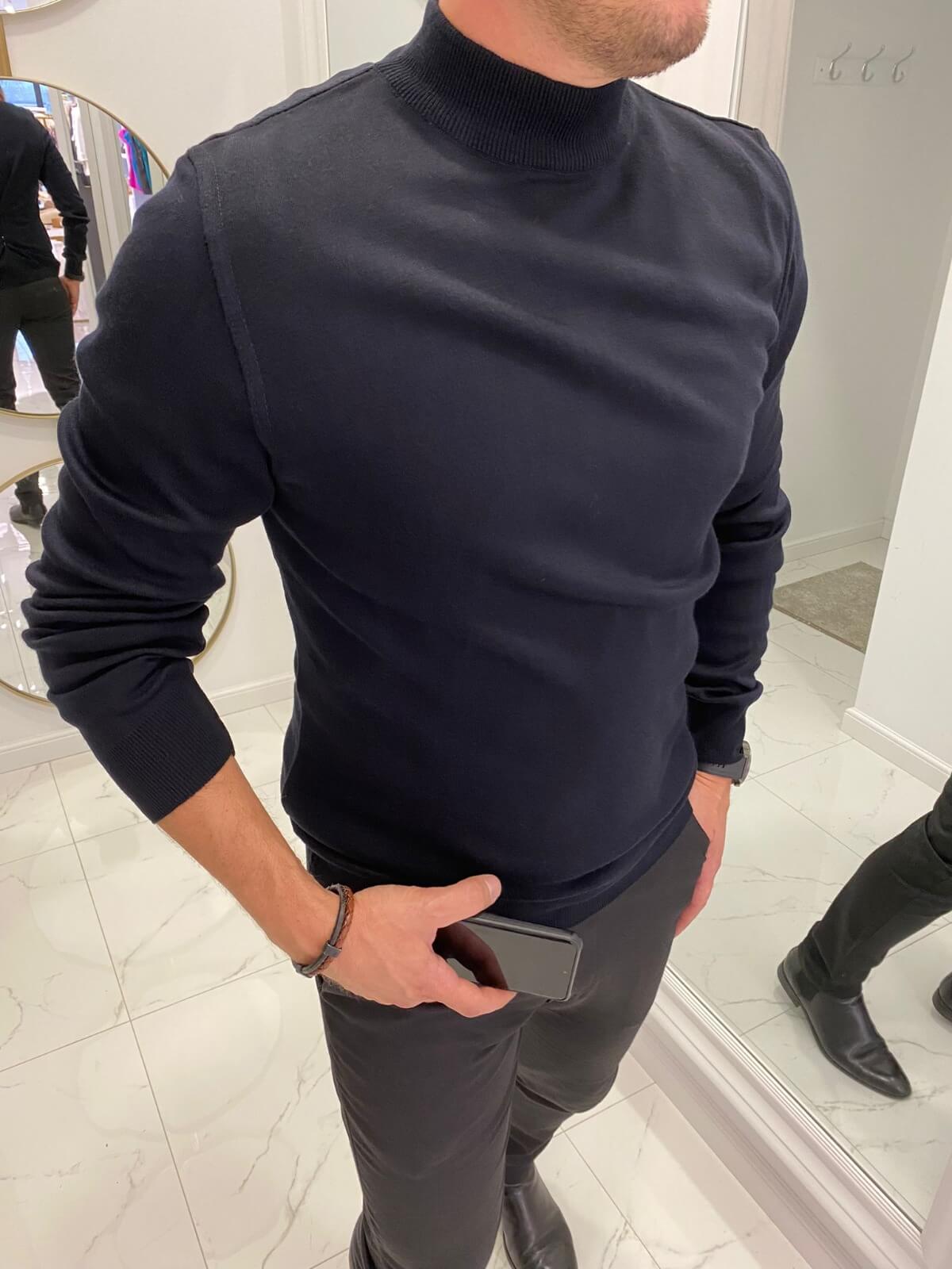 Półgolf męski wełniany Granatowy. Miękki i przyjemny do ciała materiał, który nie mechaci się i nie rozciąga. Jednokolorowy bez wzorów. Klasyczny oraz wełniany ze stójką. Najwyższa jakość wykonania. Bez wątpienia świetnie sprawdza się w chłodne miesiące, przede wszystkim znakomicie się układa. Dodatkowo dopasowuje do każdej sylwetki. Doskonały do większości stylizacji.