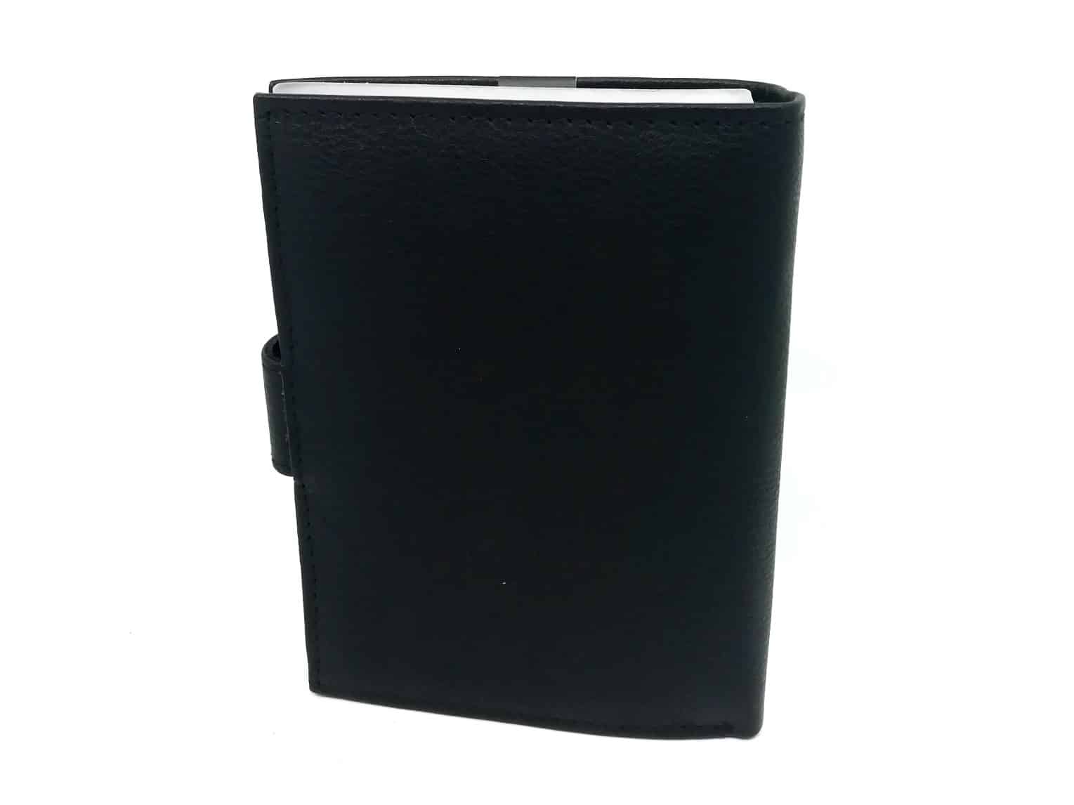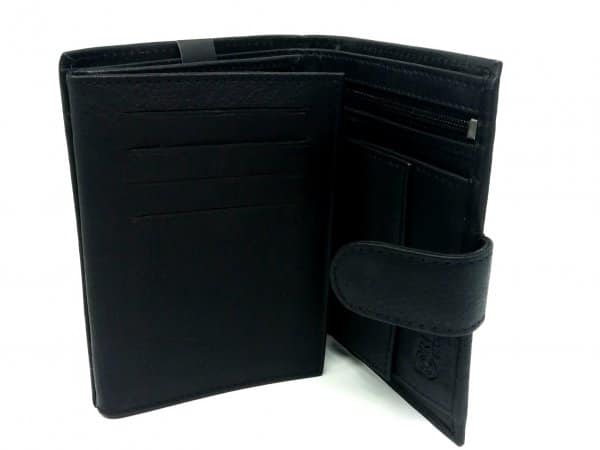 Model z zapięciem na nap o orientacji pionowej. Główna klapa posiada 13 miejsc na dokumenty o wielkości karty kredytowej, miejsce na dowód rejestracyjny, harmonijkową przegrodę na drobne monety i wizytówkę oraz obszerną i dwudzielną przegrodę na banknoty, a jedna z nich jest zasuwana na zamek.