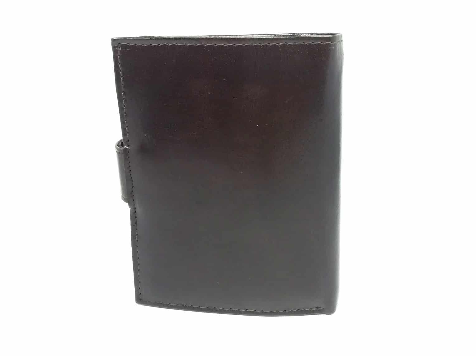 Model o orientacji pionowej, zapinany na nap. Główna klapa posiada 10 miejsc na dokumenty o wielkości karty kredytowej, miejsce na dowód rejestracyjny i zdjęcia, harmonijkową przegrodę na drobne monety i wizytówkę oraz obszerną i dwudzielną przegrodę na banknoty, w tym jedną zasuwaną na zamek.