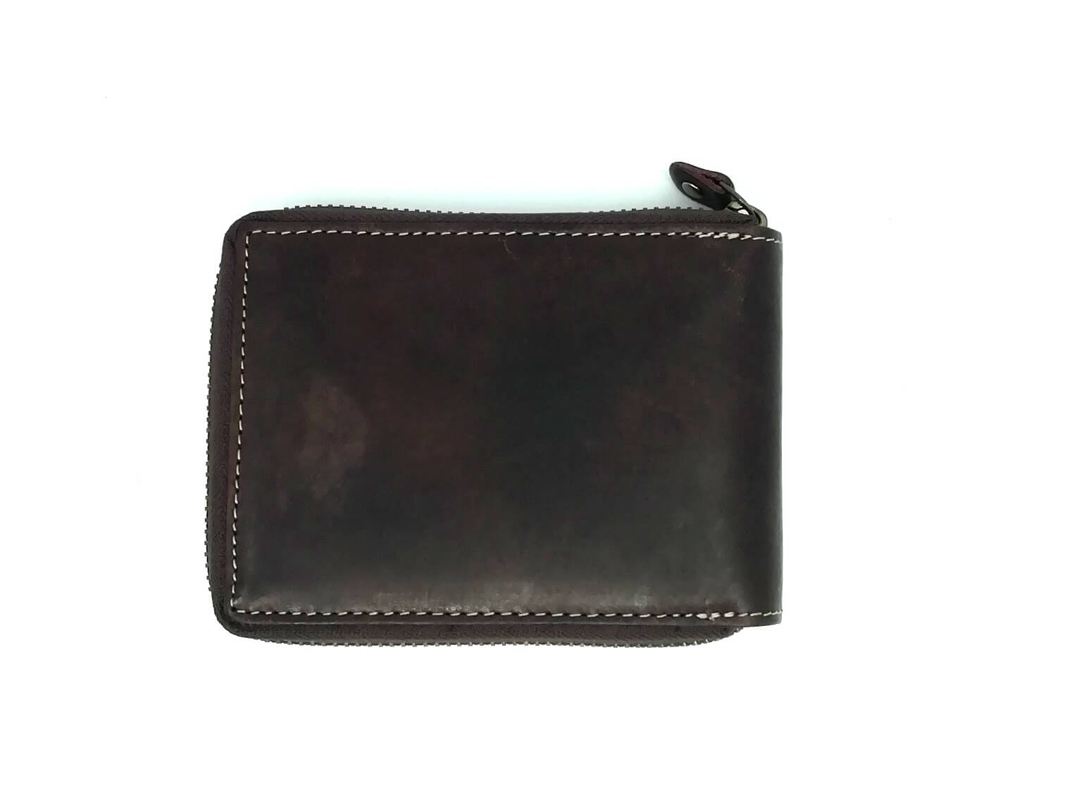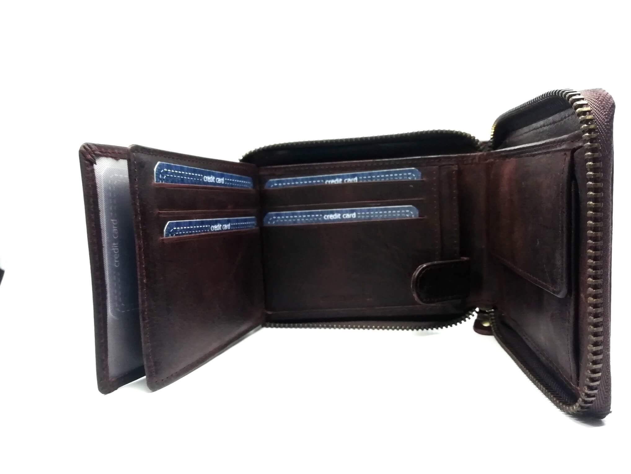 Model zapinany na zamek o orientacji poziomej. Główna klapa posiada 8 miejsc na dokumenty o wielkości karty kredytowej, harmonijkową przegrodę na drobne monety i wizytówkę oraz obszerną i dwudzielną przegrodę na banknoty.