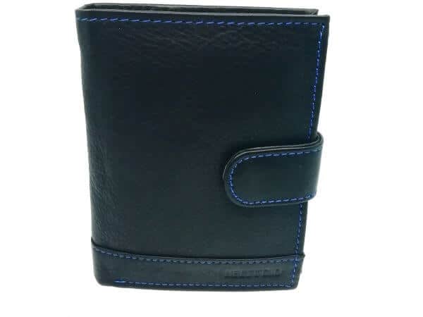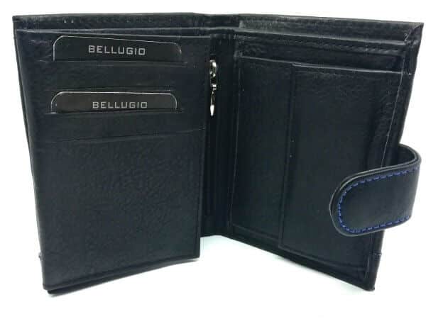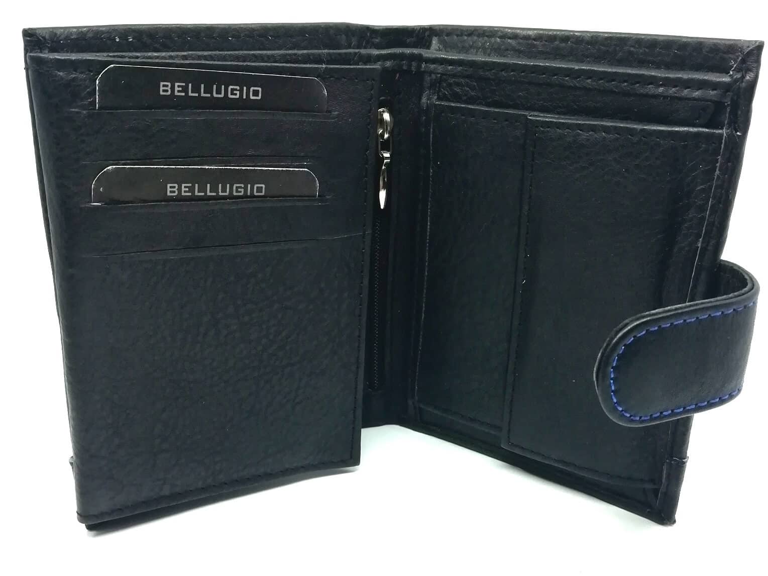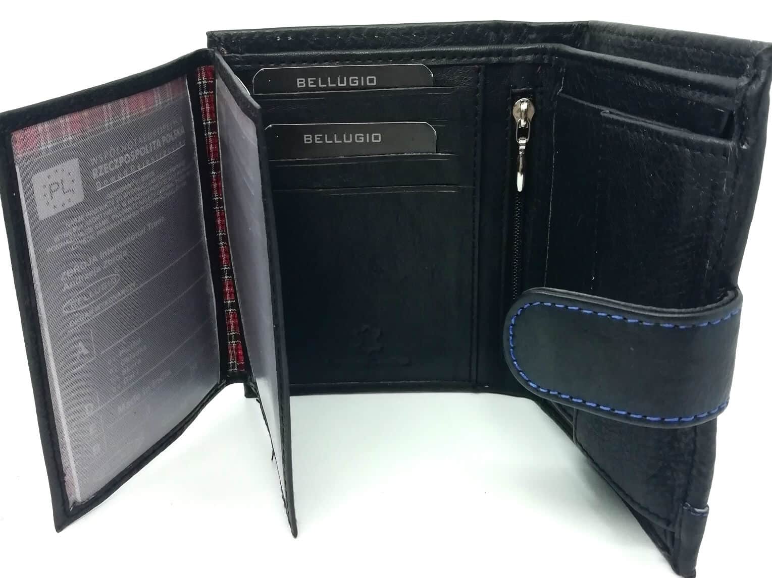 Portfel Męski Bellugio czarny, posiadający niebieskie obszycie to doskonała opcja dla niego. Klasyczna czerń nigdy nie wychodzi z mody.
