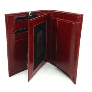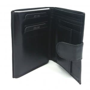Model o orientacji pionowej, zapinany na nap. Główna klapa posiada 6 miejsc na dokumenty o wielkości karty kredytowej, miejsce na dowód rejestracyjny i zdjęcia, harmonijkową przegrodę na drobne monety i wizytówkę, obszerną przegrodę na banknoty oraz schowek na zamek.