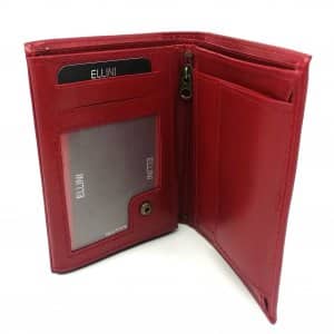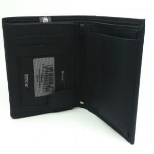 Model o orientacji pionowej. Główna klapa posiada 9 miejsc na dokumenty o wielkości karty kredytowej, miejsce na dowód rejestracyjny i zdjęcia, harmonijkową przegrodę na drobne monety i wizytówkę oraz obszerną i dwudzielną przegrodę na banknoty, schowek na zamek.