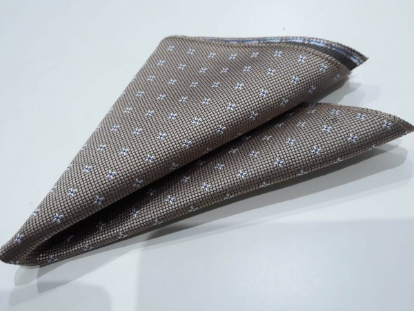 Jasno brązowa poszetka w kwiatki o wymiarach 27×27 cm. Ten ozdobny element jest dopełnieniem całej męskiej stylizacji i świadczy o dużym wyczuciu stylu jej właściciela. Jest wiele reguł, jeśli chodzi o jej dobór do pozostałych dodatków. Z pewnością nie powinna być wykonana z tej samej tkaniny co krawat lub mucha. Zalecane jest jednak, aby nawiązywała do nich kolorystycznie.