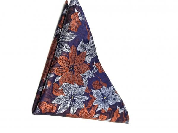Poszetka granatowa w pomarańczowo szare kwiaty.