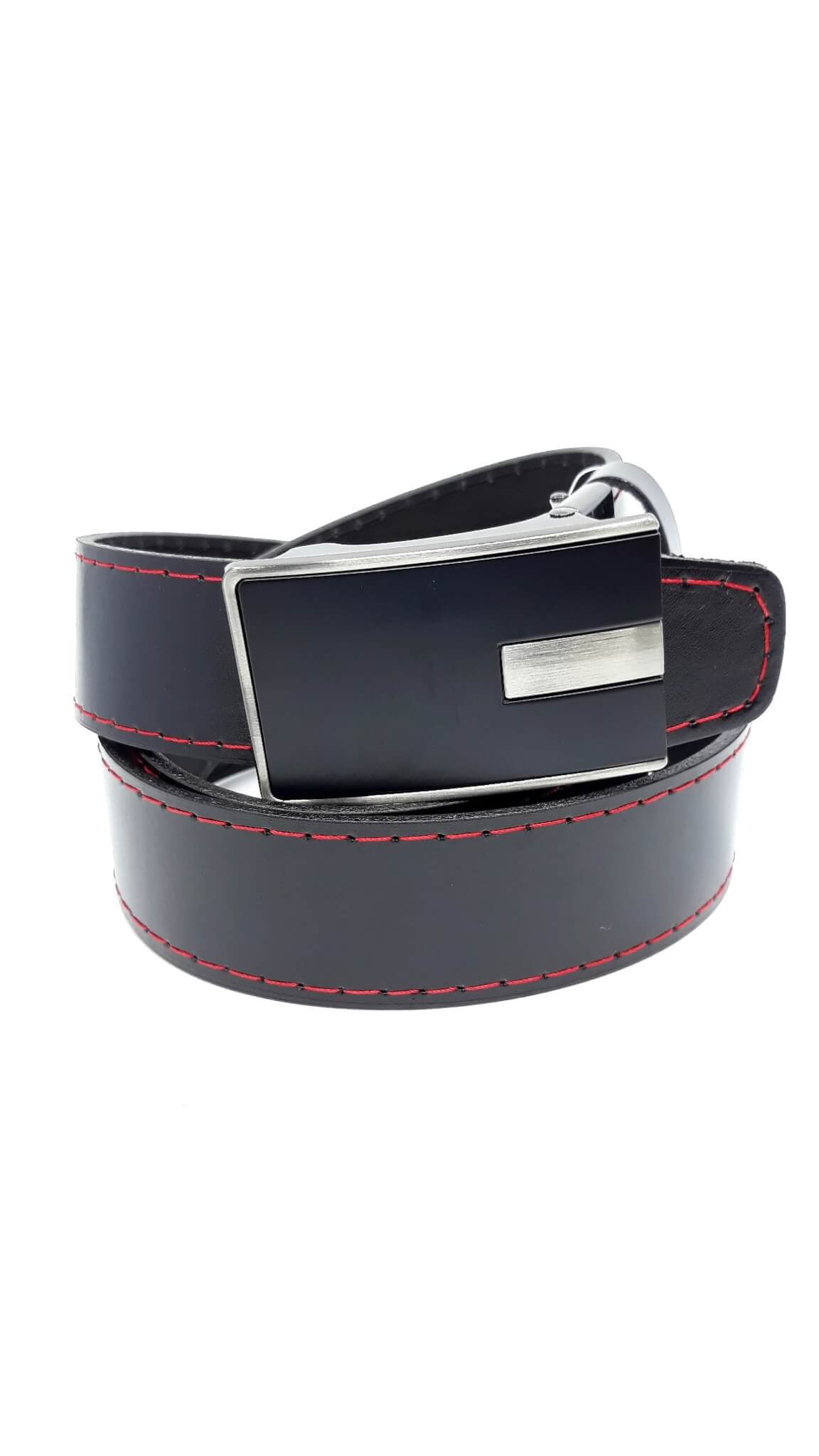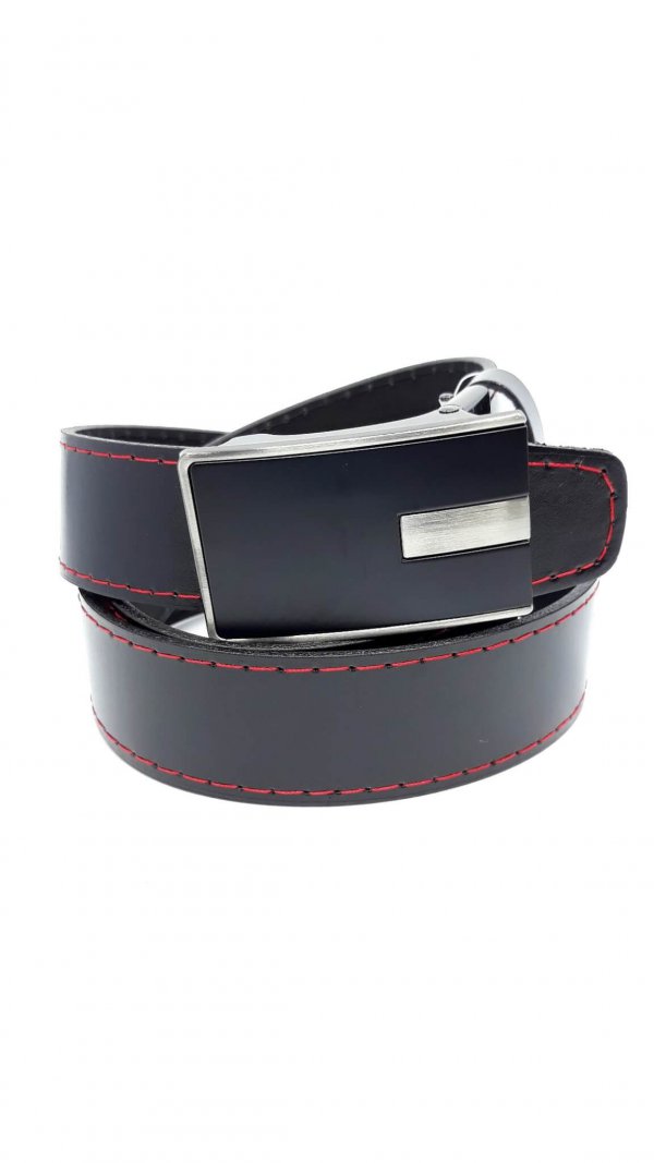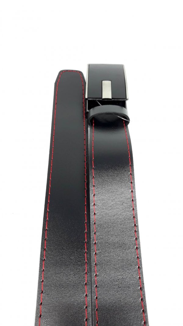 Skórzany czarny pasek do spodni, posiadający czerwone obszycie wykonany z naturalnej skóry przez polskiego producenta