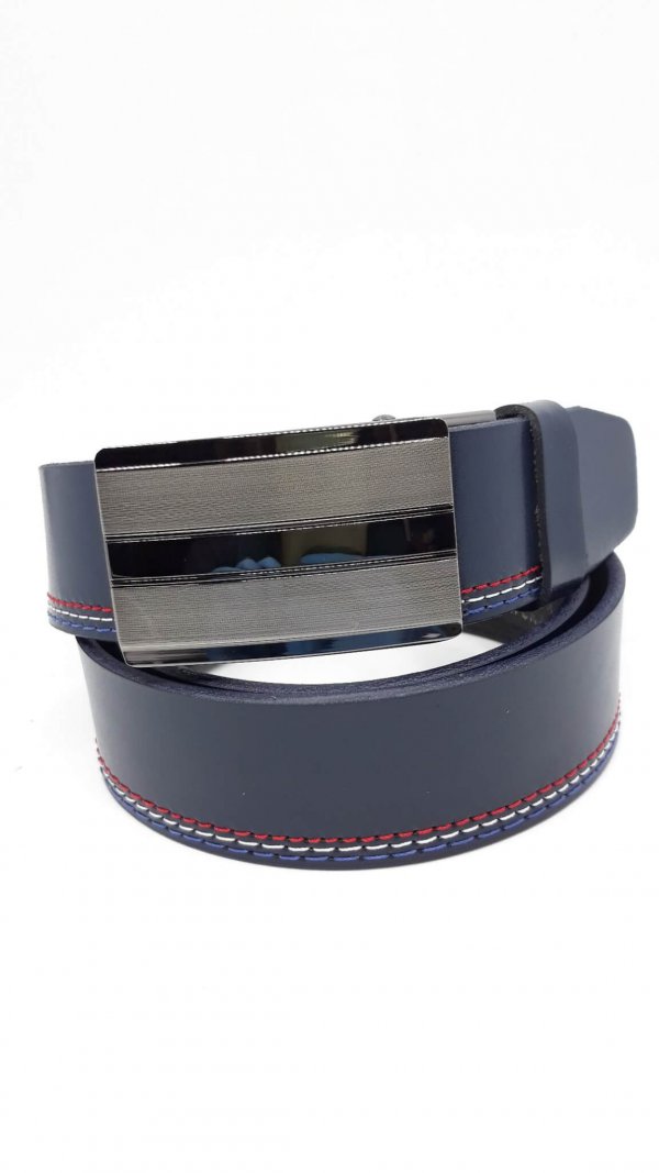 Skórzany pasek granatowy do spodni, posiadający obszycie wykonany z naturalnej skóry przez polskiego producenta.