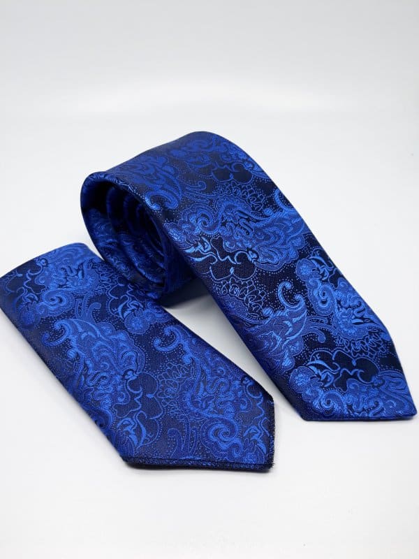 Elegancki krawat męski firmy Gabriel o klasycznym i modnym kroju w zestawie z idealnie pasująca poszetką .Komplet dostępny jest w kolorze szafirowym w turecki wzór.