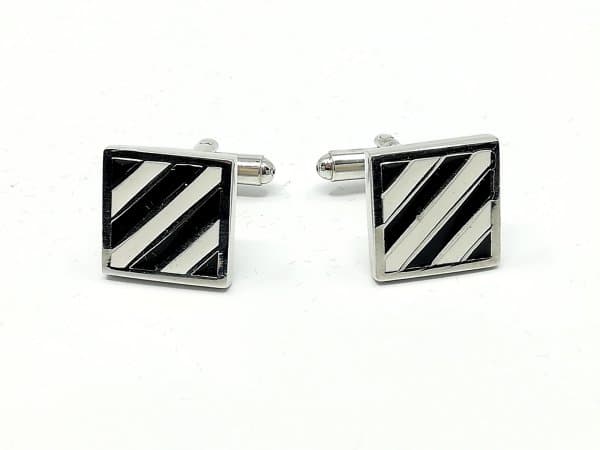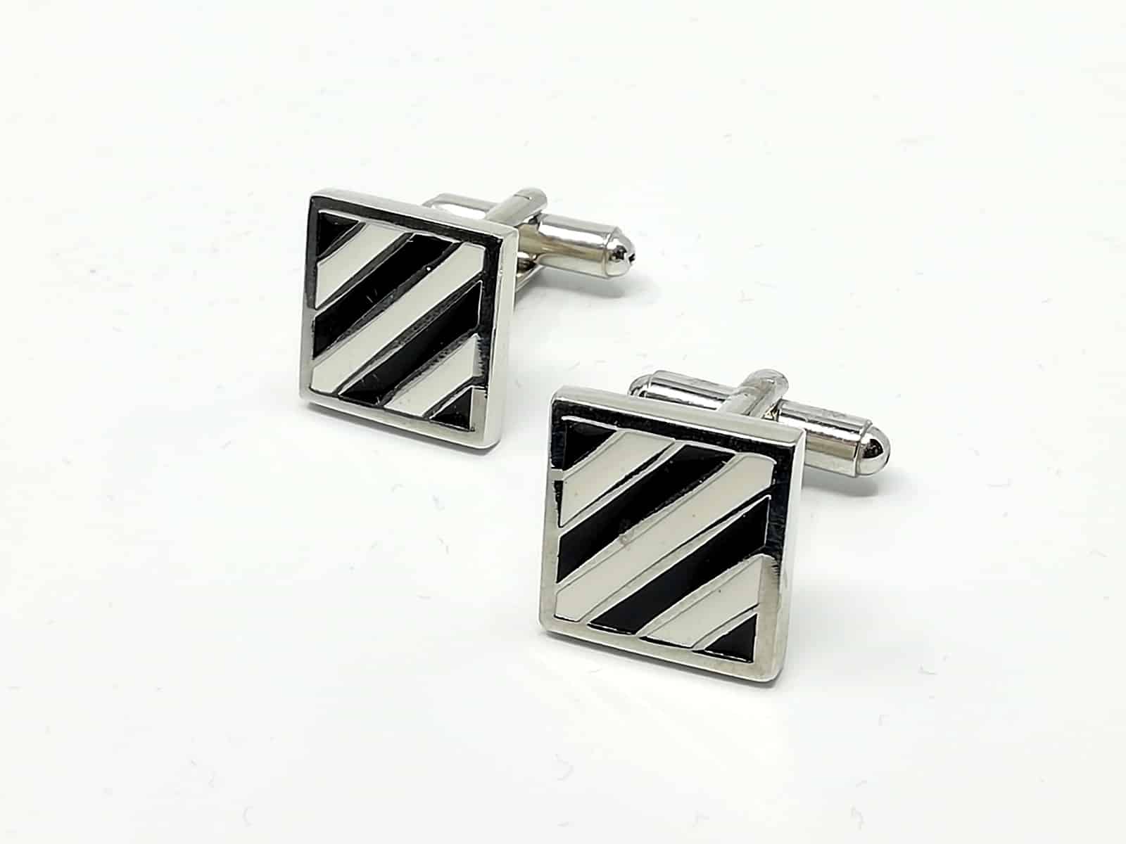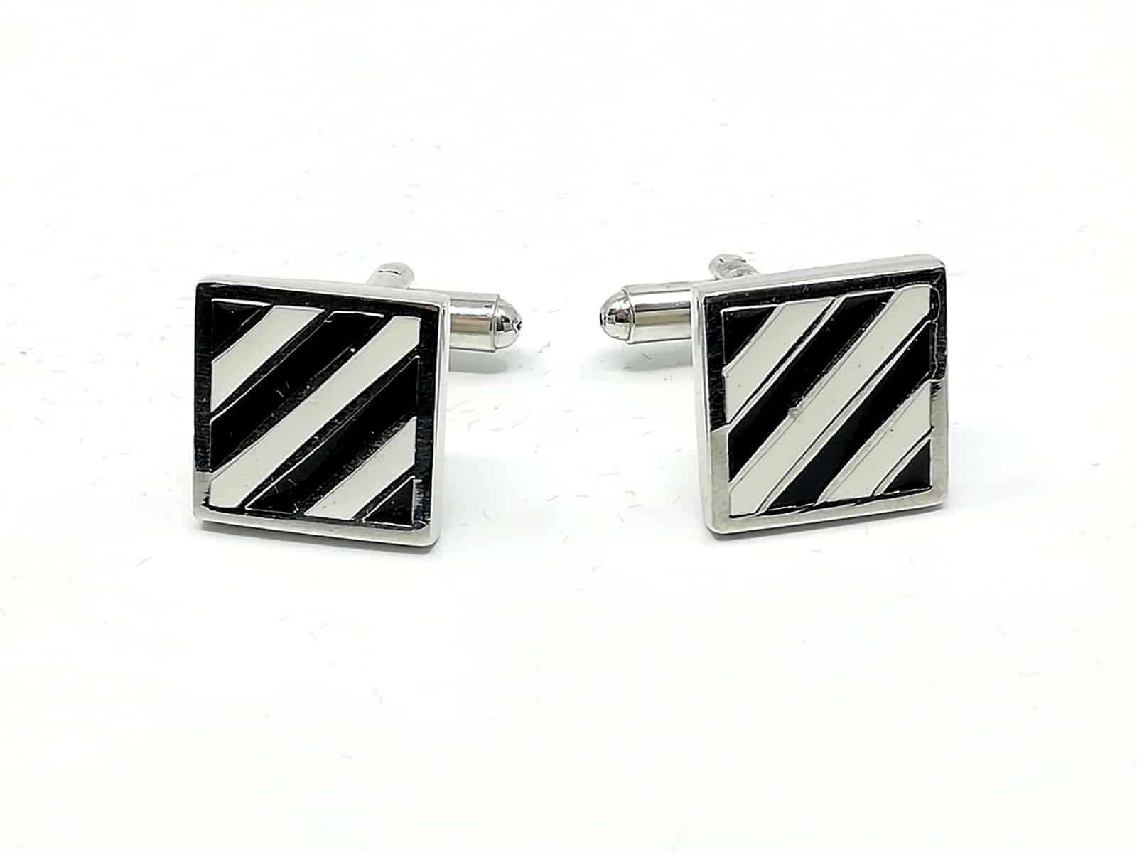 Wyjątkowe spinki do mankietów czarno białe w paski. Wykonane z materiałów o wysokiej jakości z duża dbałością o szczegóły.