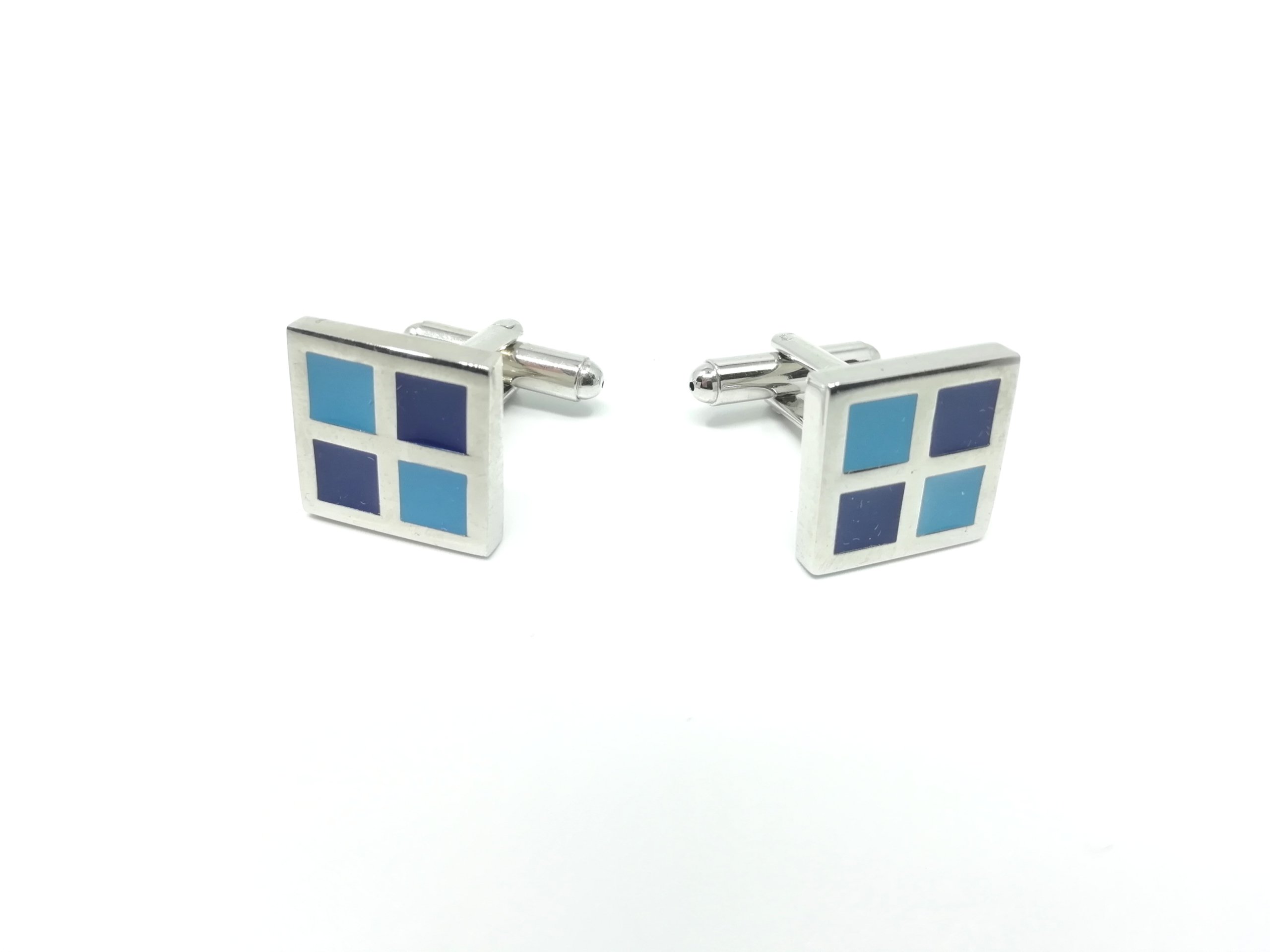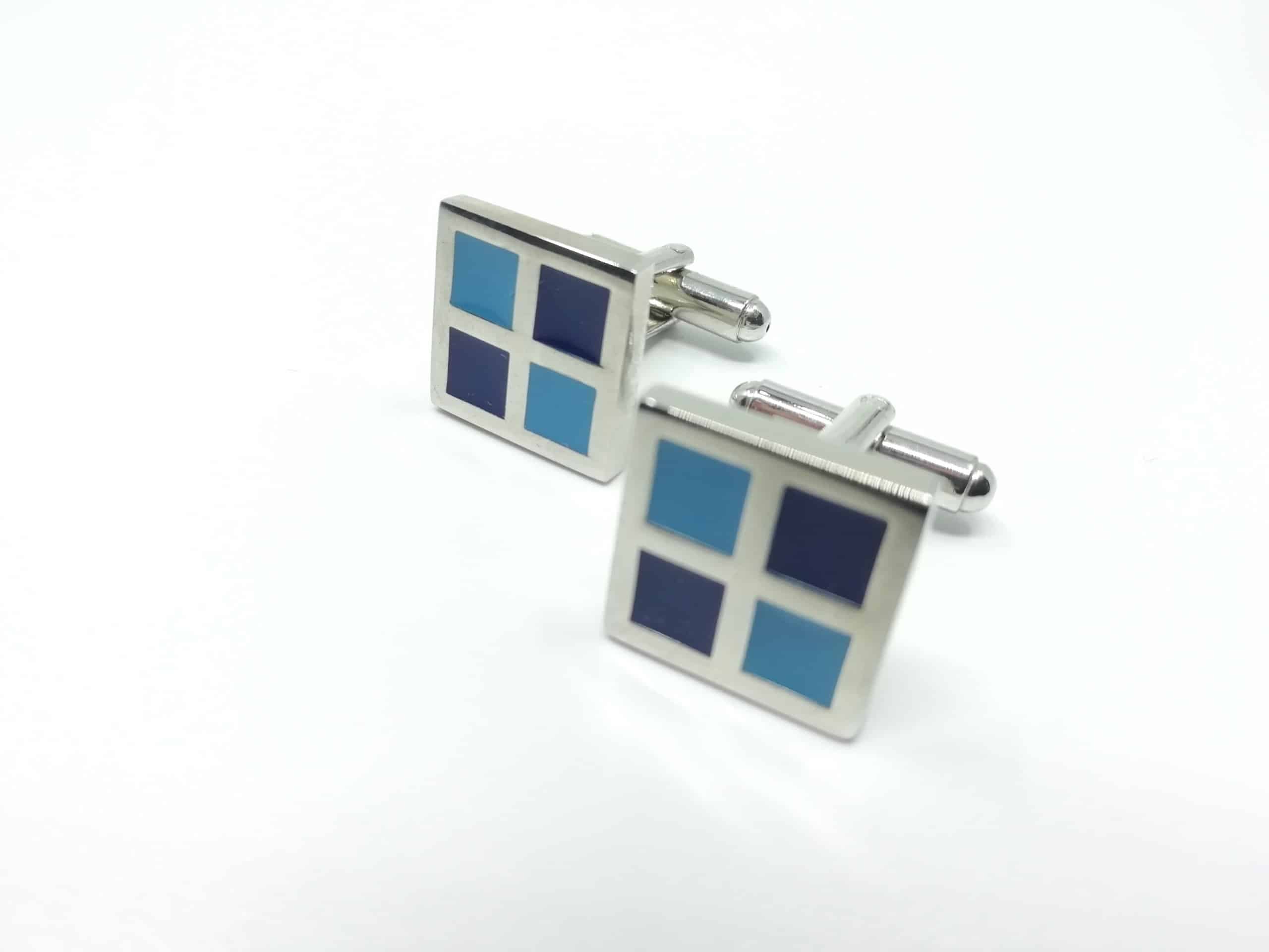 Wyjątkowe spinki do mankietów srebrne, posiadające kwadraciki niebiesko granatowe. Wykonane z materiałów o wysokiej jakości z duża dbałością o szczegóły. Spinki do mankietów stanową świetne uzupełnienie stroju każdego eleganckiego mężczyzny. Mogą również pełnić role zabawnego akcentu pokazującego zainteresowania noszącego je gentelmena. Jest to również jeden z niewielu elementów męskiej biżuterii, na który może pozwolić sobie mężczyzna. W połączeniu z bardziej lub mniej oficjalną koszulą tworzą niecodzienny i stylowy wygląd.
