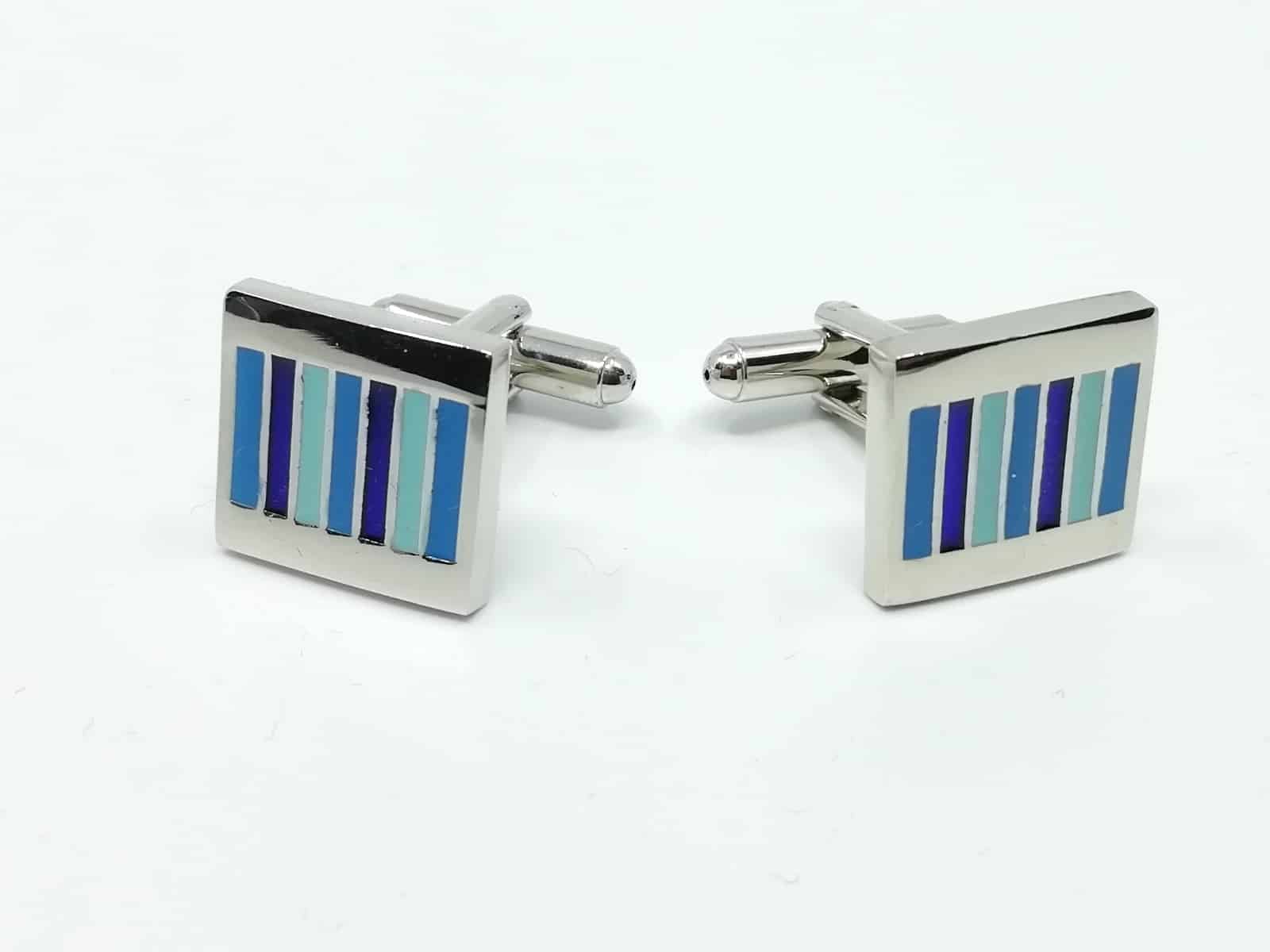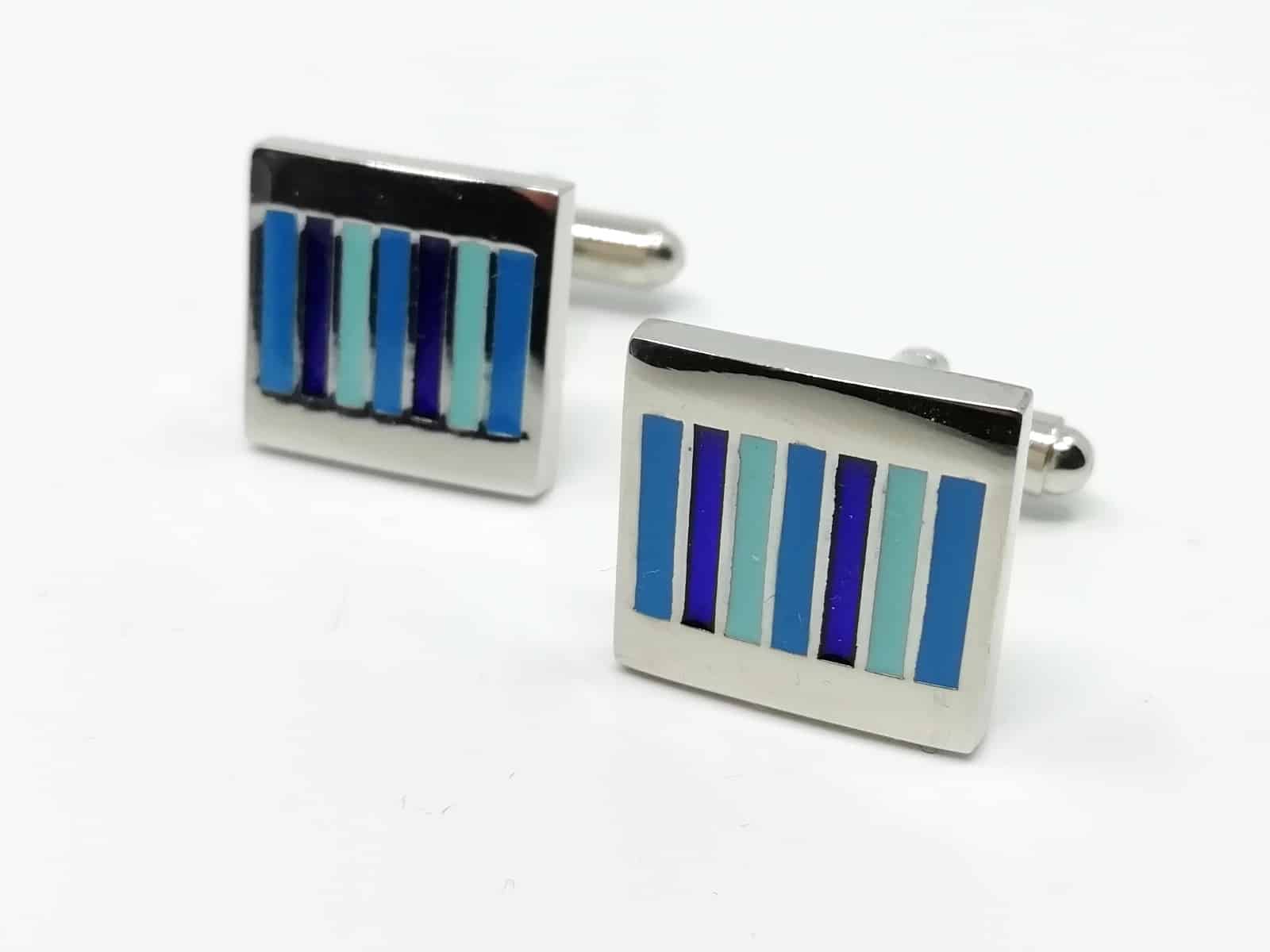 Wyjątkowe spinki do mankietów kwadratowe w niebieskie paski. Wykonane z materiałów o wysokiej jakości z duża dbałością o szczegóły.