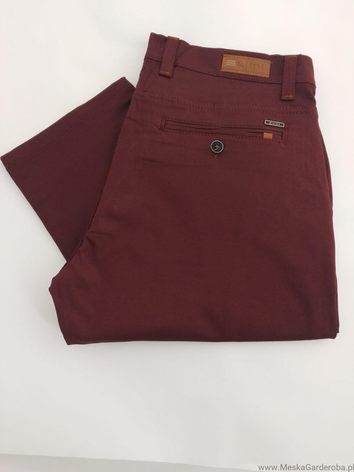 Spodnie męskie typu chinos – bordowe. Slimowany krój spodni bez wątpienia fantastycznie układa się na męskiej sylwetce. Wykonane z miękkiej bawełny z domieszką lycry zapewniają wysoki komfort noszenia. W rzeczywistości kolor spodni jest dużo żywszy.