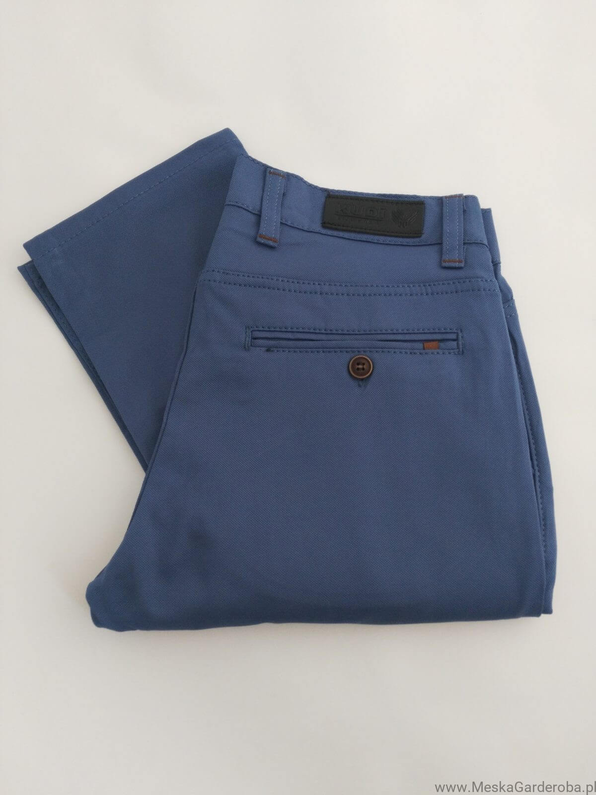 Spodnie męskie typu chinos – niebieskie. Slimowany krój spodni bez wątpienia fantastycznie układa się na męskiej sylwetce. Wykonane z miękkiej bawełny z domieszką lycry. Zapewniają wysoki komfort noszenia. W rzeczywistości kolor spodni jest dużo żywszy i jaśniejszy.