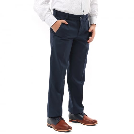 Spodnie chłopięce granat uszyte z gładkiego granatowego materiału w kantkę. Nie obrobiamy je na dole co powoduje iż mozna je dogodnie podwijać wraz z rosnącym dzieckiem. Pas posiada regulację co ułatwia dobranie do odpowiedniej szerokości pasa. Takie pojedyncze spodnie z pewnością przydadzą się na komunie czy inne szkolne uroczystości.