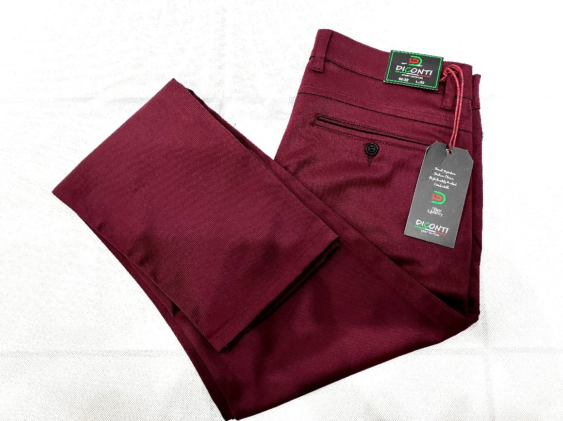 Spodnie męskie Diconti wiśniowe. Lekko slimowany krój spodni bez wątpienia fantastycznie układa się na męskiej sylwetce. W rzeczywistości kolor spodni jest dużo żywszy.(W zależności od ustawień monitora kolor spodni może nieznacznie odbiegać od koloru rzeczywistego )
