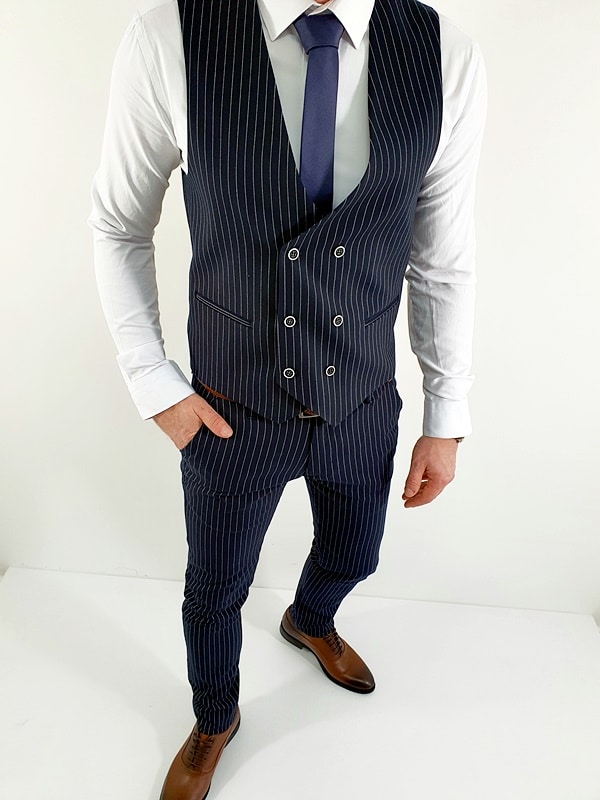 Spodnie męskie typu chinos, granatowe w białe paski. Slimowany krój spodni bez wątpienia fantastycznie układa się na męskiej sylwetce. Wykonane z miękkiego materiału z domieszką lycry. Zapewniają wysoki komfort noszenia. Z pewnością idealnie pasują do modnej w tej sezonie kamizelki oraz białej koszuli.